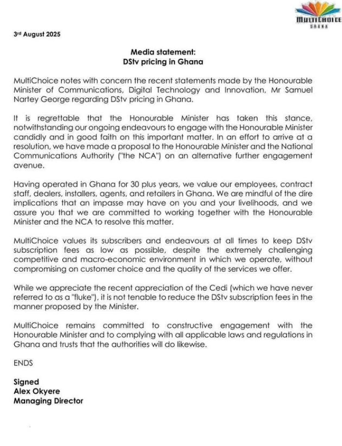 MultiChoice also underscored its longstanding presence in Ghana, noting over three decades of contribution to the local media landscape. It emphasized that any abrupt regulatory action would negatively affect its workforce, partners, and consumers who rely on its services for entertainment, education, and information.